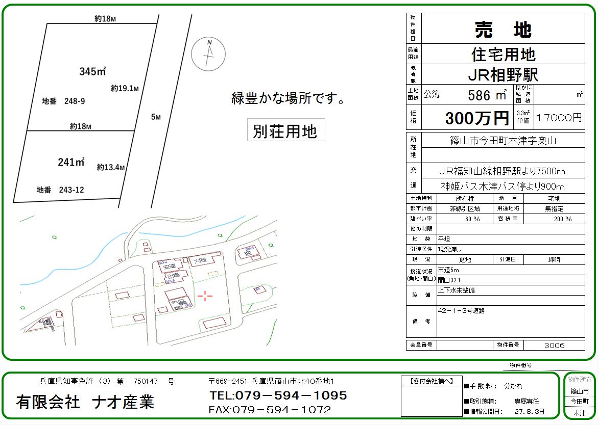 池上字小屋前坪 売り土地 物件の詳細を見る 価格 1,300万円 売地 坪単価12万円 所在地兵庫県丹波篠山市 池上字小屋前坪 交通JR福知山線 篠山口駅 バス(神姫バス篠山営業所 乗25分 停歩1分) JR福知山線篠山口駅より車で10分 面積 土地 357.22m² 物件番号3035